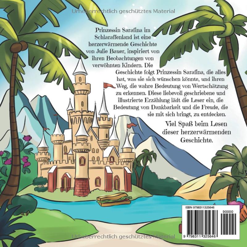 Prinzessin Sarafina im Schlaraffenland ist eine berührende Erzählung von Julie Bauer, inspiriert durch ihre Beobachtungen von verwöhnten Kindern. Die Geschichte handelt von Prinzessin Sarafina, die alles hat, was sie sich wünschen kann, und ihrer Reise, die wahre Bedeutung von Wertschätzung zu verstehen. Diese wunderschön gestaltete Geschichte ermutigt die Leser, den Wert von Dankbarkeit zu erkennen und die Freude, die damit einhergeht. Das Buch bietet eine einzigartige Gelegenheit, Lebensweisheiten und Werte zu erkunden, während es das Sprachenlernen fördert. Geeignet für Familien und Pädagogen.