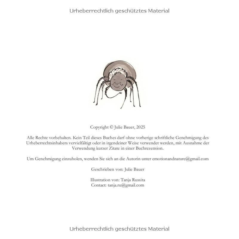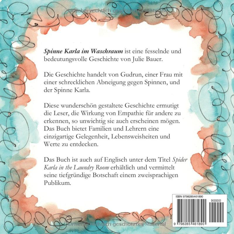 Diese wunderschön gestaltete Geschichte ermutigt die Leser, die Wirkung von Empathie für andere zu erkennen, so unwichtig sie auch erscheinen mögen. Das Buch bietet Familien und Lehrern eine einzigartige Gelegenheit, Lebensweisheiten und Werte zu entdecken.Das Buch ist auch auf Englisch unter dem Titel “Spider Karla in the Laundry Room“ erhältlich und vermittelt seine tiefgründige Botschaft einem zweisprachigen Publikum.